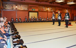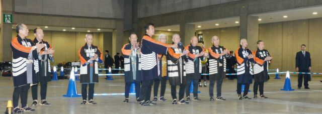 | 平成27年東京消防出初式 平成27年1月6日 晴天に恵まれさほど寒さを感じない有明・東京ビッグサイトにて新春恒例の始め式・出初式が行われた。 東京消防出初式の前に、江戸消防記念会の「始め式」が行われ、小宮名誉会長・望月会長による年頭の挨拶の後、東京消防庁の大江消防総監からご挨拶をいただいた。 その後、一旦東館ホールで待機し、再度入場した。梯子乗りの開始を知らせる「半鐘」が第一區六番組筒先によって叩かれると、各區木遣師たちが木遣を歌う中、梯子乗りが始まり「がんばろう日本」とした懸垂幕を第一選手が一斉に下ろしてから演技がはじまった。時おり強い風が吹く中、選手達はものともせず、得意な技を披露した。 再度東館ホールに戻り望月会長の挨拶に続き、手締めが行われ終了した。 |