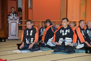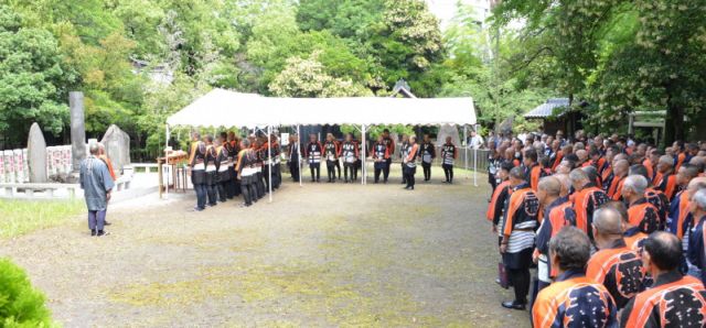 | 祐天寺 木遣法要 平成27年4月6日 桜が舞い落ちつつもピンクの枝垂桜が咲き誇っている中、地元第八區頭取中の木遣に先導されて、貫首と職衆が木遣塚前に揃うと読経が始まった。各區総代の焼香と読経が済むと、貫首から御札をいただき、ご挨拶があり儀式は終了した。再び第八區頭取中に先導されて退場された。その後、年番の第一區頭取中による木遣が奉唱され、望月会長の手締めでお開きとなった。 |