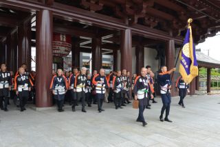 | 成田山新勝寺 定例参拝 10月6日 10月6日快晴の新勝寺は大勢の参詣客で賑わっていた。 年番第六區の小頭が持つ会旗を先頭に、約300名の集団が総門から木遣行進を開始した。 最初の石段を登り、仁王門を通過し、急な石段を登り切った。 ひときわ大きな木遣の声に、参詣客が注目する中、本堂前に到着した。 全員で記念写真を撮った後、各區総代が本堂内に上がり、安全祈願の護摩を焚いて貰った。 |