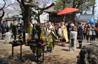| 祐天寺 木遣法要 平成29年4月6日 満開の桜の下、地蔵堂より地元第八區の頭取中の木遣に先導されて、貫首が入場されて法要が始った。 各區総代が順次焼香し読経が終わると、会長が御札を授けられ、貫首が挨拶をされて退場された。 その後、年番第三區の頭取中による木遣が奉唱され、会長の手締めでお開きとなった。 |