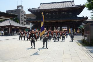 成田山新勝寺は大勢の参詣客で賑わっていた。年番第八區の小頭が持つ会旗を先頭に、約300名の集団が総門から木遣行進を開始した。