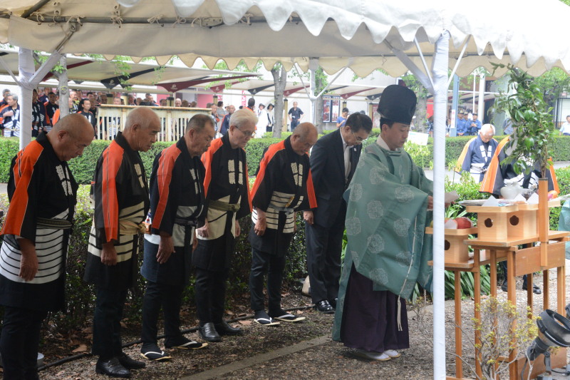江戸東京博物館・家康公銅像前で、地元牛嶋神社の神官による御祓い・祝詞の後、各區総代が玉串の奉奠を行った。その後、年番である第十一區の頭取中全員で木遣を奉納し、二人の選手が梯子の演技を行い、芝ア会長の手締めで終了した。